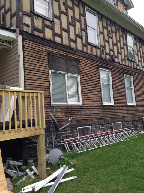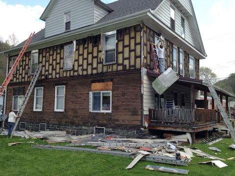 Below is the house at 43 Main Street that would eventually become the new River House Lodge. This photo was taken just after the flood of 1985. Clyde Sypolt bought the house and saved it from the wrecking ball. The front porch was ripped away and the old siding, a kind of Bakelite product that was very popular after WWII, was removed by Clyde Sypolt and replaced with vinyl siding. That remained on the house until I began restoration. He had begun work on it when the picture was taken in 1985.